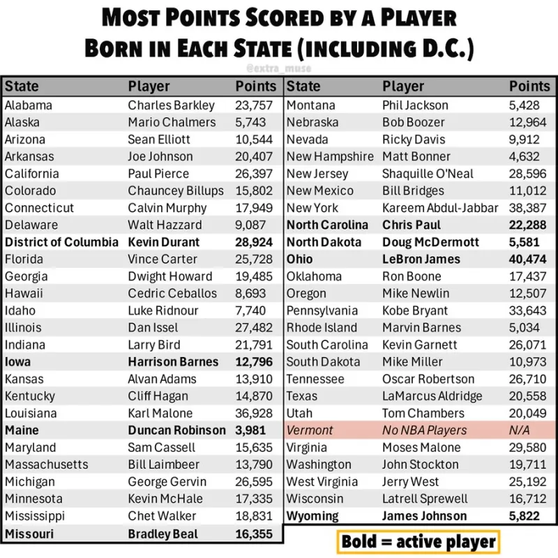 08月07日讯 数据媒体Extra Muse今日更推,晒出一张美国各州出生,生涯总得分最高的NBA球员。(加粗=现役)