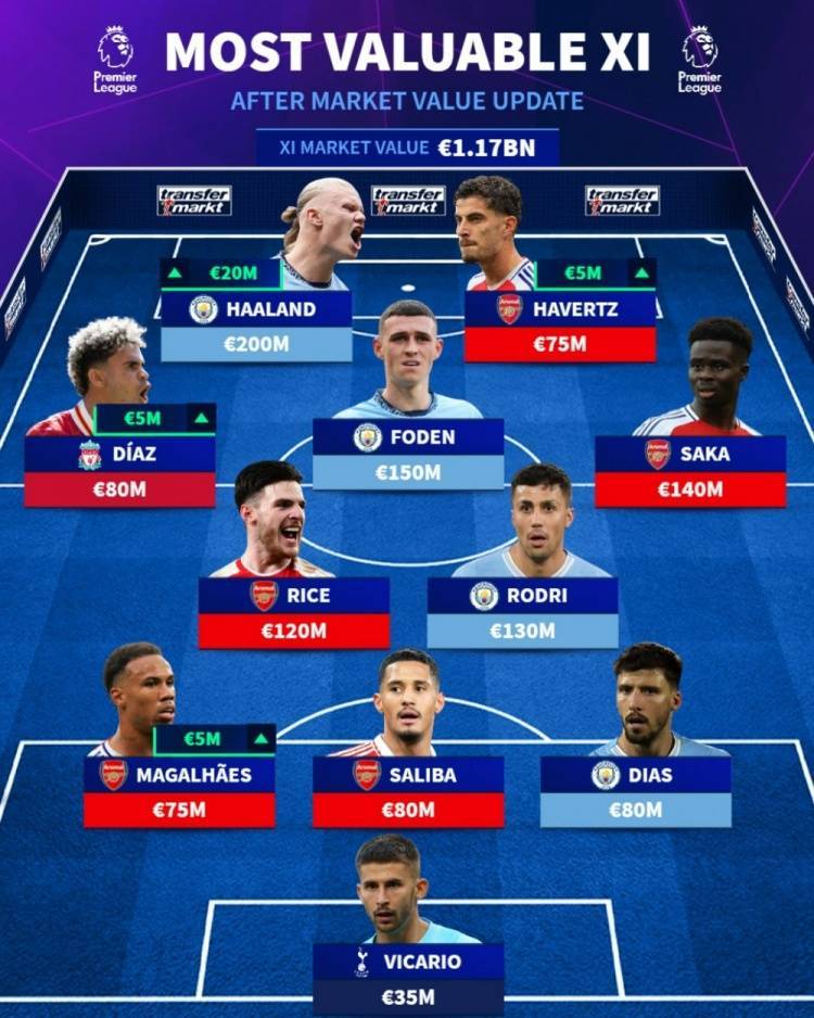 直播吧10月3日讯 德转在更新英超球员身价后,盘点了目前身价最高的11人阵容,其中2亿欧的哈兰德领衔,福登、萨卡等球员在列,曼城、阿森纳共有9人入选。以下为具体阵容: